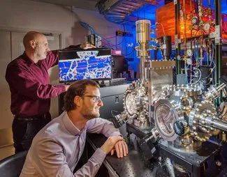 桑迪亞國(guó)家實(shí)驗(yàn)室的研究人員Michael Chandross(左)和Nic Argibay展示了用于預(yù)測(cè)其鉑金合金前所未有的耐磨性的計(jì)算機(jī)模擬,以及用于演示的環(huán)境摩擦計(jì)。圖片提供:蘭迪蒙托亞,SNL